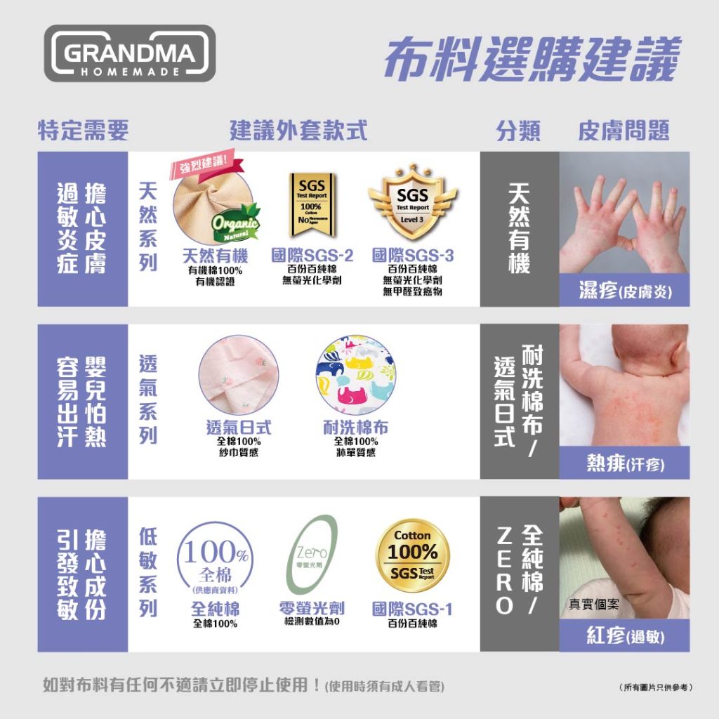 布料選購貼士:曾有個案嬰兒本身無皮膚問題,但使用某布料就出現過敏,轉用「天然有機」解決相關問題,但需約1個月待徵狀減退才可使用。